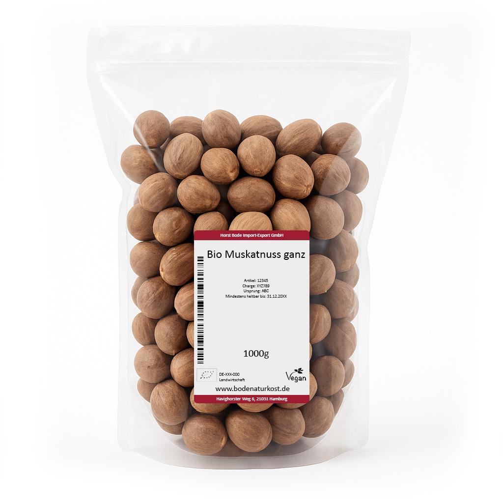 Celé muškátové orechy mají hnedou barvu a oválný tvar s drsným povrchem. Sladká, mírne drevitá chut je neco zcela zvláštního. Casto se používá k zdobení bramborových jídel, jako jsou bramborová pyré a g ratiny, ale je také vynikající pro zeleninu, polévky a guláše. Chut si rádi doplnují muškátem, nastrouhanou slupkou muškátového orechu, také známou jako muškátová kvetena. Tento bio produkt je ekologicky pestován a sklízen.